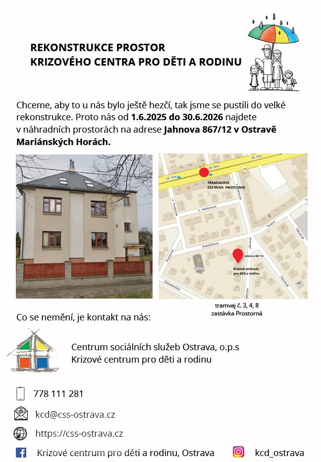 Krizové centrum pro děti a rodinu se pustilo do velké rekonstrukce. Proto je od 1. 6. 2025 do 30. 6. 2026 najdete v náhradních prostorách na adrese Jahnova 867/12 v Ostravě – Mariánských Horách.